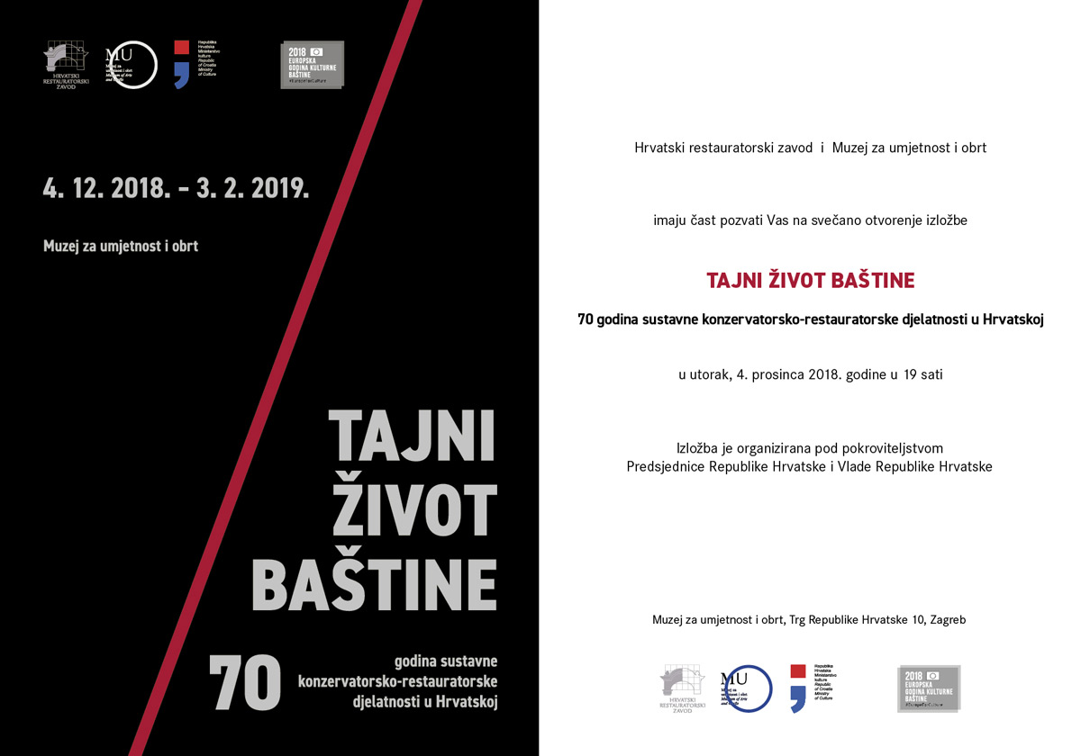 Hrvatski restauratorski zavod i Muzej za umjetnost i obrt imaju čast pozvati Vas na svečano otvorenje izložbe „Tajni život baštine. 70 godina sustavne konzervatorsko-restauratorske djelatnosti u Hrvatskoj“ u utorak, 4. prosinca 2018. godine u 19 sati u Muzeju za umjetnost i obrt (Trg Republike Hrvatske 10, Zagreb). Izložba je organizirana pod pokroviteljstvom predsjednice Republike Hrvatske i Vlade Republike Hrvatske.