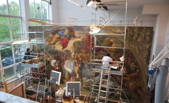 Konzervatorsko-restauratorski radovi na slikama Parnas i Susret pape Lava I. Velikog s Atilom započeli su ipak tek 2013. godine na Odjelu za štafelajno slikarstvo Hrvatskoga restauratorskog zavoda u Zagrebu. Prethodno je na poticaj Hrvatske akademije znanosti i umjetnosti pregledano stanje slika u spremištu. Zapažena je nestabilnost i ugroženost slikanog sloja, koji se odvajao i otpadao s platna, te veliki nabori zgužvana i oslabljena tkanog nositelja. Tijekom 2013. i 2014. godine obavljena su detaljna istraživanja stanja materijala i oštećenja na slikama te su identificirane ranije intervencije i popravci. Usporedo se izvodila konsolidacija nestabilnih slojeva boje i osnove, kao i površinsko čišćenje. Na objema su slikama izravnati nabori platna te je oslabljeno tkanje podstavljeno novim platnom i napeto na posebno konstruirane samozatežuće aluminijske podokvire.