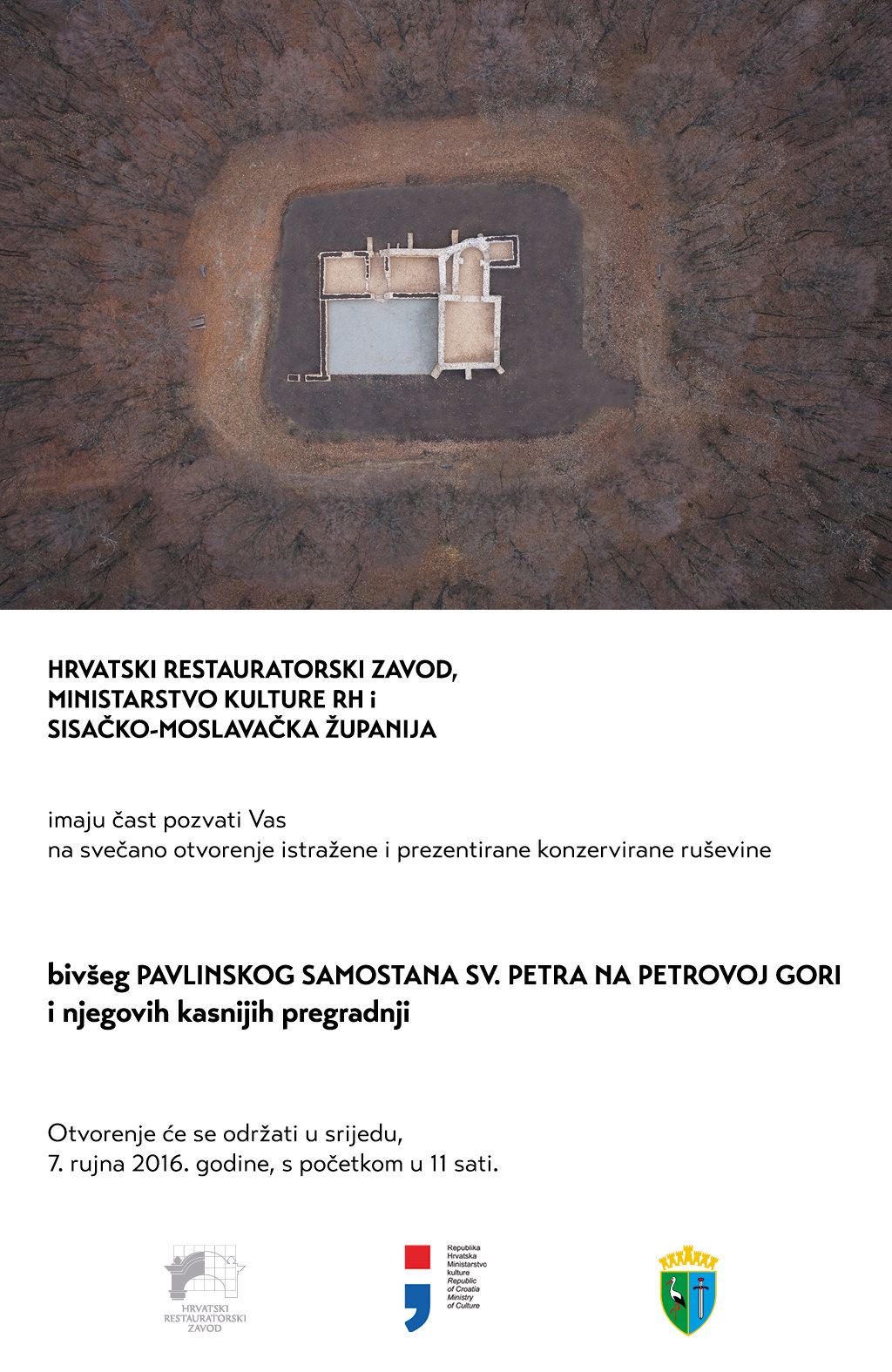 Hrvatski restauratorski zavod, Ministarstvo kulture RH i Sisačko-moslavačka županija imaju čast pozvati Vas na svečano otvorenje istražene i prezentirane konzervirane ruševine bivšeg pavlinskog samostana sv. Petra na Petrovoj gori i njegovih kasnijih pregradnji u srijedu, 7. rujna 2016. u 11 sati. O istraživanjima, radovima i prezentaciji pavlinskog samostana sv. Petra na otvorenju govorit će g. Davor Trupković, pomoćnik ministra kulture, g. Marin Piletić, zamjenik župana Sisačko-moslavačke županije i dr. sc. Tajana Pleše, v.d. ravnatelja Hrvatskog restauratorskog zavoda.