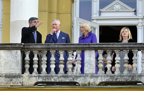 Uz premijera Tihomira Oreškovića i suprugu Sanju, princa od Walesa i vojvotkinju od Cornwalla u ponedjeljak su u Banskim dvorima dočekali ravnatelj Hrvatskoga restauratorskog zavoda Mario Braun i konzervatorica povjesničarka umjetnosti Andrea Šimunić.
