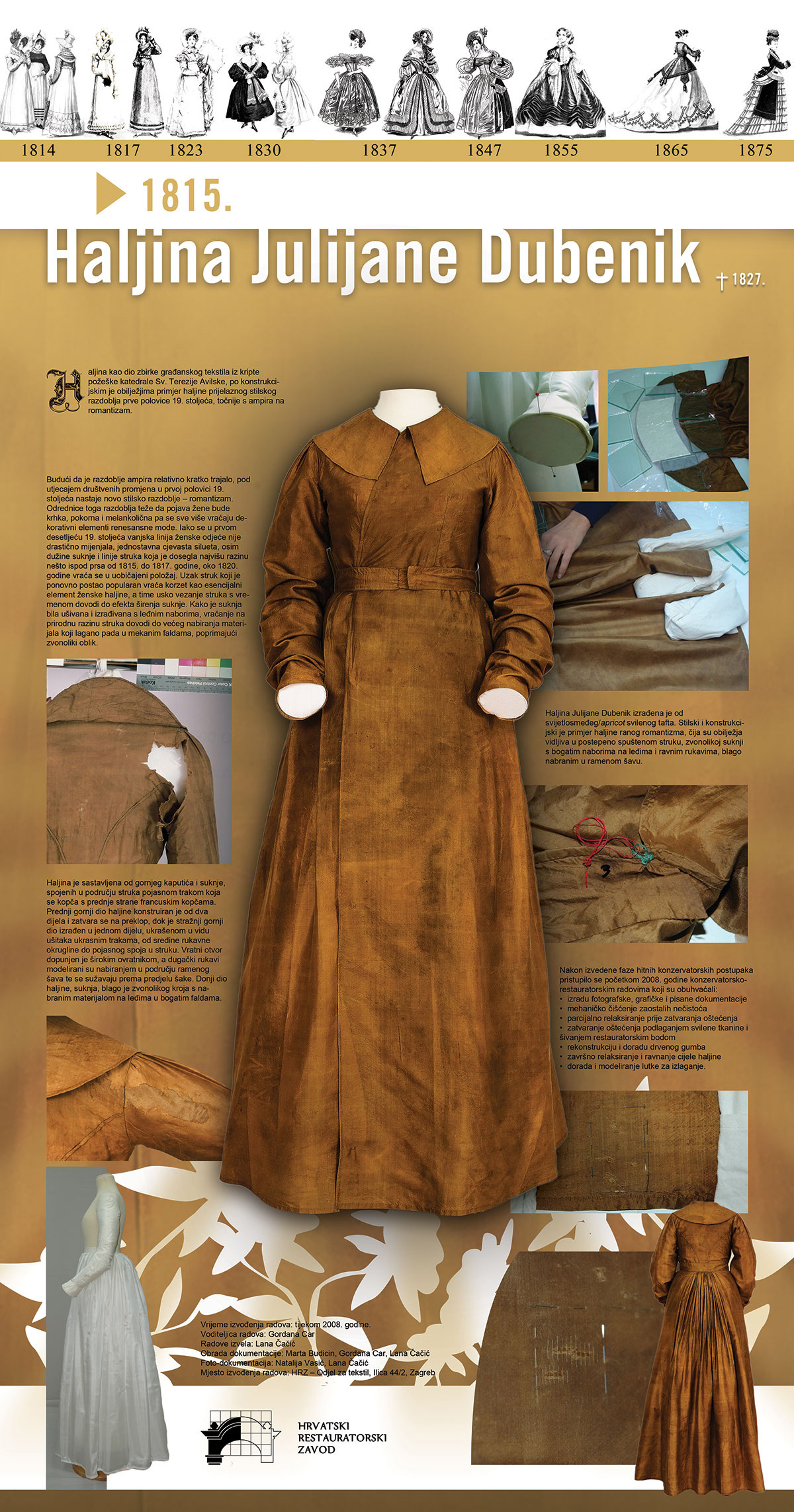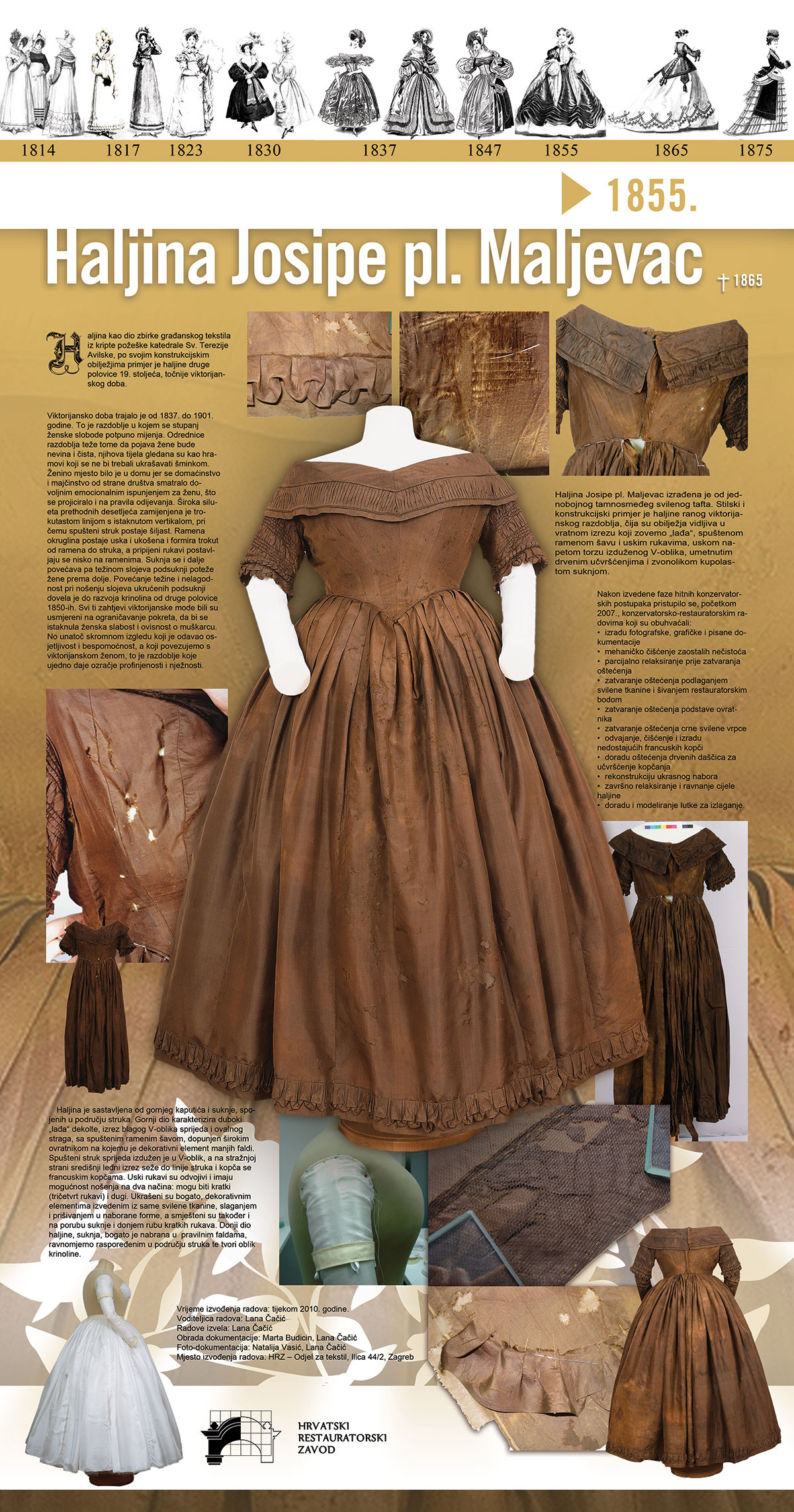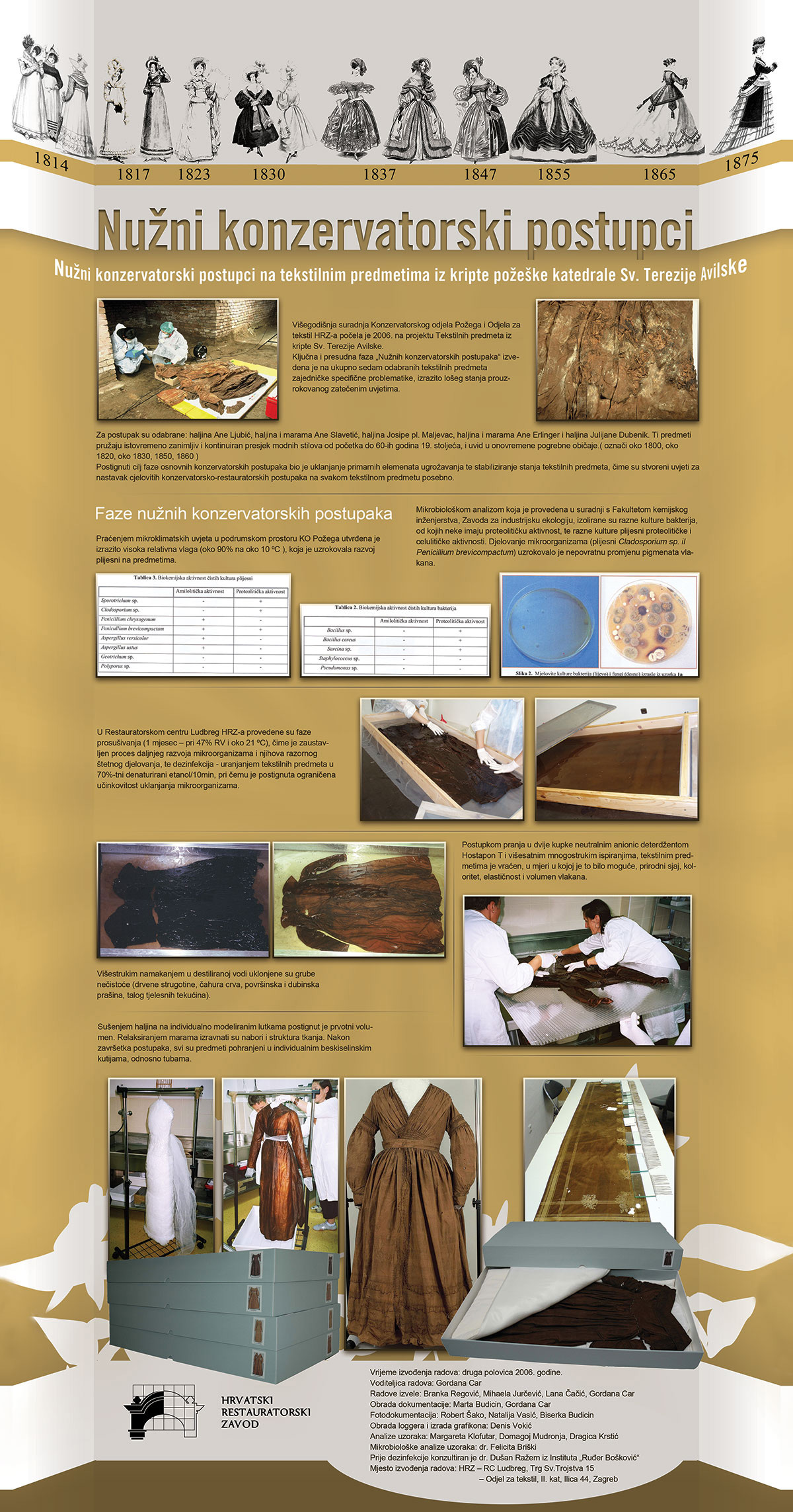 Nije čest slučaj da su pogrebni tekstilni predmeti očuvani u toj mjeri da im se može vratiti izvorna fleksibilnost te da se nakon završetka radova mogu izložiti na lutkama i prezentirati javnosti. Upravo u slučaju tekstilnog inventara kripte katedrale sv. Terezije Avilske stanje predmeta to je omogućilo. Riječ je o situaciji gdje je moguće istovremeno prezentirati veći broj haljina s popratnim predmetima koje nas na osobit način, od desetljeća do desetljeća vode kroz devetnaesto stoljeće, dajući presjek čestih promjena i razvoja modnih stilova. Uz to, haljine odabirane za posljednji ovozemaljski put spona su između života i smrti pokojnica i pričaju nam priče o svojim vlasnicama i njihovom životu. Ta spoznaja ne ostavlja nas ravnodušnima i pobuđuje poštovanje.