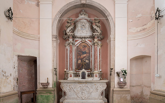 Kameni oltar je 1779. godine izradio Giovanni Mattiuzzi iz Udina, čija je radionica vrlo aktivno djelovala na području Istre tijekom 18. i 19. stoljeća. Stilska analiza upućuje na zaključak da je autor oltarne pale oslikao i strop crkve. Iako je za sada nepoznat, pretpostavlja se da dolazi iz Furlanije, gdje je vjerojatno već surađivao s Matiuzzijevom radionicom.