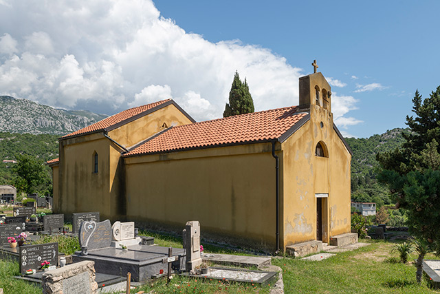 Međutim, sondiranjem je ustanovljeno da je svih osam uglova crkve – ne računajući sakristiju, za koju se neupitno potvrdilo da je naknadno prigrađena uz ožbukanu crkvu – djelomično ili potpuno nelogično izvedeno lošijim materijalom. Radi se o lokalnom crvenom konglomeratu od kojega se sastoji i uslojena litica uz čiji je rub podignuta sama crkva. Dijelovi pročelja drukčije građe dijagonalno se sužavaju prema navedenoj visinskoj granici kao predmnijevana posljedica uklanjanja uglova i time uvjetovane/omogućene daljnje razgradnje. Imajući u vidu napuštanje naselja i utvrde u prvih nekoliko desetljeća novoga vijeka, ta se pojava nedvojbeno tumači kao antropogena dilapidacija crkve tijekom osmanske ugroze. Treba istaknuti da je promjena prisutna jedino u visini koja odgovara dosegu s tla. Razlog može biti namjerno onesposobljavanje zdanja na strateškoj lokaciji u slučaju neprijateljskog zauzimanja naselja nakon povlačenja vojne posade 1537. godine, ali i puko pribavljanje kvalitetnih uglovnjaka kao solidnog okvira za bilo kakvu zidanu strukturu.