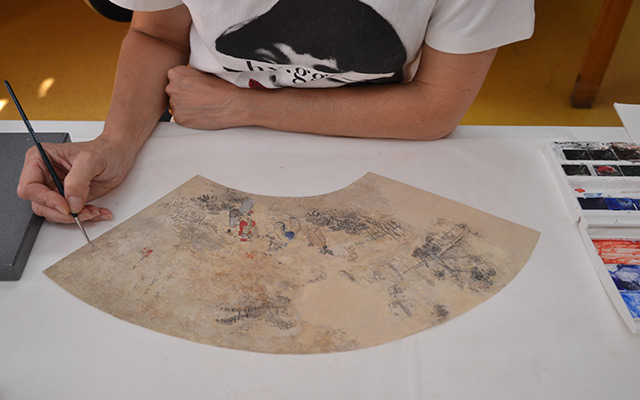 Oslikani listovi lepeza bili su u vrlo lošem stanju: s brojnim gubicima nosioca, pregibima i poderotinama, prekriveni površinskom nečistoćom i mrljama, a zbog izloženosti visokoj vlažnosti zraka došlo je do deformiranja i odvajanja karakteristične japanske impregnacije (podloge) od papirnatog nosioca te djelomičnog pucanja i ljuštenja slikanog sloja. Cilj konzervatorsko-restauratorskih radova bilo je uklanjanje nečistoća, stabilizacija nosioca, impregnacije i slikanog sloja te nadomještanje nedostajućih dijelova kako bi predmeti bili zaštićeni od daljnje ubrzane degradacije.