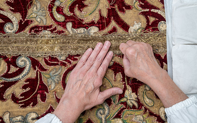 Tijekom konzervatorsko-restauratorskih radova 2020. godine (voditeljica Sandra Lucić Vujičić, Odjel za tekstil, papir i kožu, Služba za pokretnu baštinu) otkriveni su fragmenti svilenih tkanina iz 16. i 18. stoljeća kojima su nadomješteni nedostajući dijelovi izvornih tkanina te dvije vrste ukrasnih mesinganih traka. Izvorna dekoracija zavjese izrađena je tehnikom veza a riporto, upotrebom svilenih tkanina i papira, pozlaćenih i frisé uzica te raznobojnih svilenih niti. S obzirom na nove podatke, moguće je s velikim oprezom pretpostaviti dataciju katapetazeme u prijelaz 16. u 17. stoljeće, dok se izvezena godina može povezati s posljednjom većom intervencijom. Također se može pretpostaviti da je za izradu katapetazme 1800. godine upotrijebljeno nekoliko materijala.