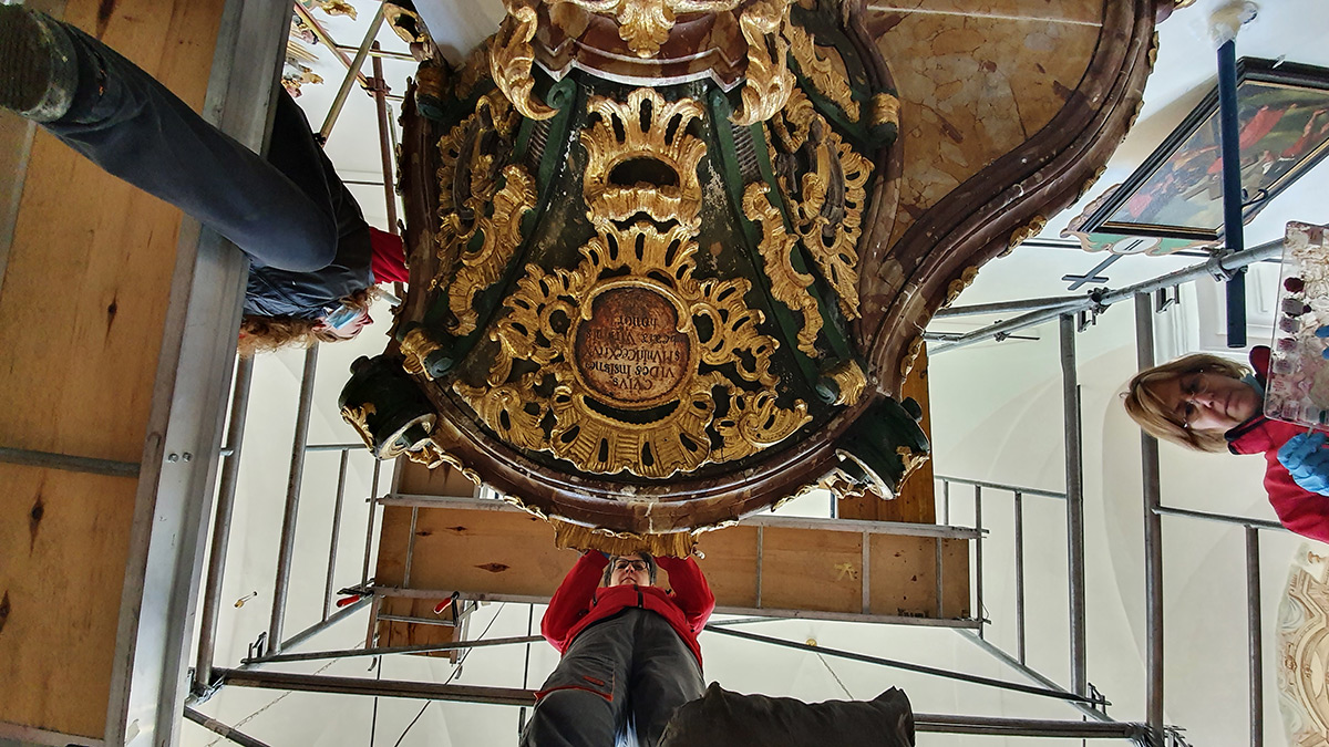 Konzervatorsko-restauratorska istraživanja počela su 2018. godine međunarodnim projektom Tragom umjetnosti obitelji Straub koji je sufinancirala Europska unija iz programa Kreativna Europa. U sklopu projekta organizirana je u Restauratorskom odjelu Ludbreg međunarodna studentska radionica Interdisciplinarnom suradnjom do baze podataka umjetnina, s koje su dotada prikupljeni povijesni i tehnički podatci pripremljeni za objavu u internetskoj bazi podataka obitelji Straub. Zbog svoje vrijednosti unutar nacionalne barokne umjetnosti te očuvanih tehnoloških svojstava i materijala, propovjedaonica je uvrštena u programsku djelatnost Hrvatskog restauratorskog zavoda financiranu sredstvima Ministarstva kulture i medija RH (voditeljica Ksenija Škarić, Odjel za drvenu polikromiranu skulpturu 2 Službe za pokretnu baštinu). Cjeloviti konzervatorsko-restauratorski radovi provode se od 2019. godine na demontiranoj arhitektonskoj plastici, skulpturama, grbu i zastoru sa slikom sv. Antuna Padovanskog u radionici, dok su na arhitekturi s pripadajućim fiksnim rezbarijama radovi izvedeni in situ. Dovršetak radova planiran je za jesen 2021. godine, kad će u crkvi biti dovršen retuš oštećenja.