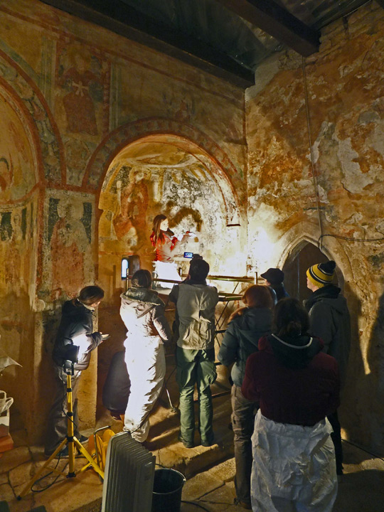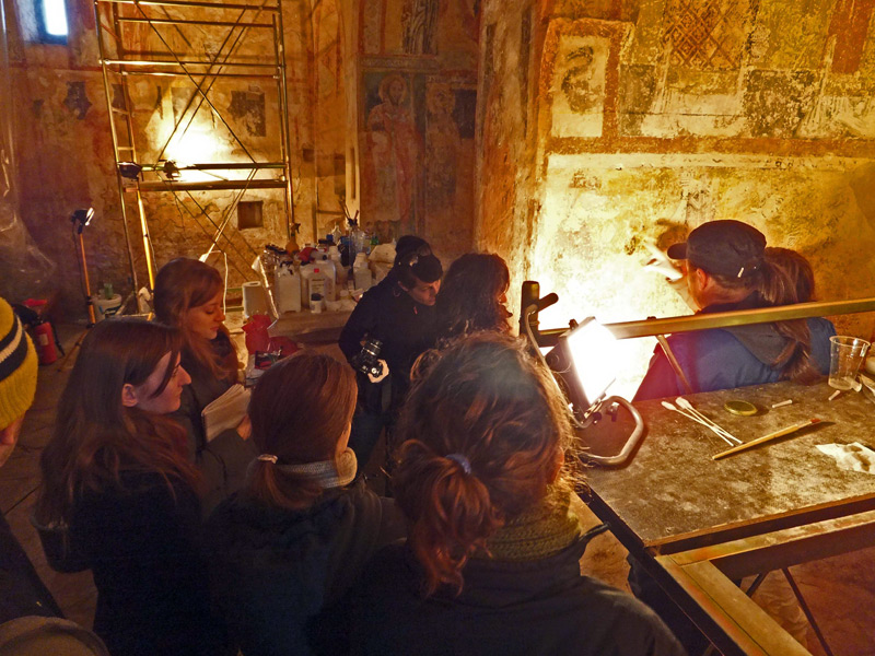Radionicu namijenjenu studentima završnih godina Odsjeka za konzerviranje i restauriranje umjetnina Likovne akademije u Zagrebu, koji su došli predvođeni profesoricom Nevom Pološki, vodile su restauratorice mag. Martina Kikelj Lesar, Ajda Mladenovič i Anita Klančar Kalčić iz Slovenije zajedno s restauratorima iz Hrvatskog restauratorskog zavoda. Ova se praktična radionica tematski nastavlja stručni skup Anorganski materijali u konzerviranju-restauriranju zidnih slika, koji je održan krajem svibnja ove godine u Restauratorskom centru Ludbreg s ciljem unaprjeđenja i poboljšanja tehnika zaštite i restauriranja zidnih slika kroz primjenu novih tehnologija. Radionicu su posjetile i konzervatorice Konzervatorskog odjela u Puli, Sandra Čelić Višnjić, Marina Boico i Krstina Gergeta Sotončić.
