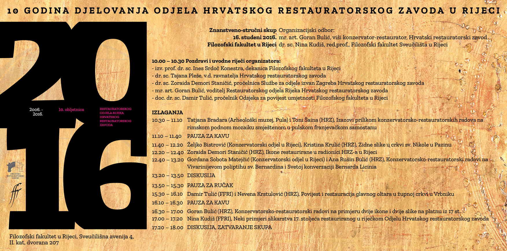 Hrvatski restauratorski zavod ima čast pozvati Vas na znanstveno-stručni skup organiziran povodom desete obljetnice djelovanja Restauratorskog odjela u Rijeci. Skup će se održati 16. studenog 2016. na Filozofskom fakultetu u Rijeci, Sveučilišna avenija 4, II. kat, dvorana 207.