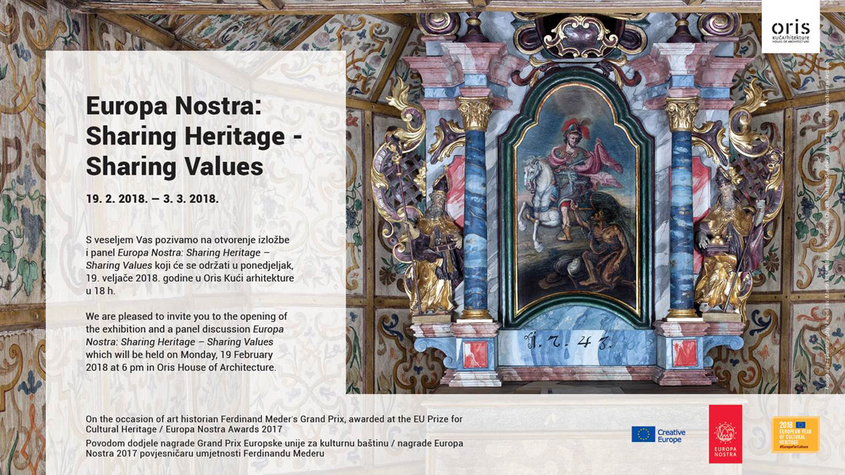 Povodom dodjele nagrade Grand Prix Europske unije za kulturnu baštinu / nagrade Europa Nostra 2017 povjesničaru umjetnosti Ferdinandu Mederu, u ponedjeljak, 19. veljače u 18 h u Oris Kući arhitekture otvorit će se izložba Europa Nostra: Sharing Heritage – Sharing Values na kojoj će biti predstavljen izabrani broj nagrađenih projekata, kao i uvid u spektar djelovanja organizacije Europa Nostra. Izložba ostaje otvorena do 3. ožujka 2018.