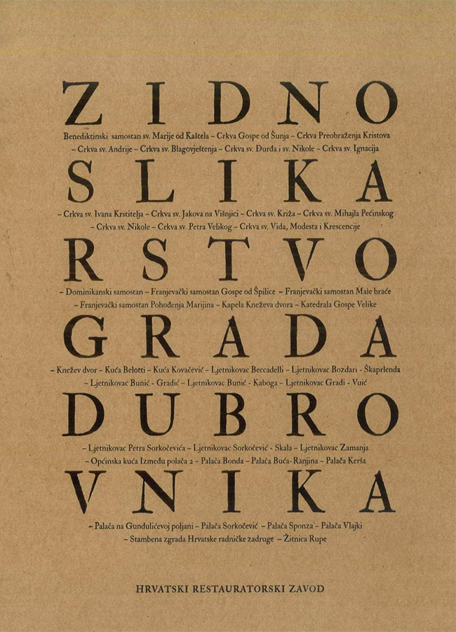 Katalog »Zidno slikarstvo Grada Dubrovnika« rezultat je višegodišnjega rada djelatnika Hrvatskoga restauratorskog zavoda i suradnika na istraživanju i obnovi spomenika dubrovačkoga područja te programa katalogiziranja zidnih slika koji se od 2011. godine provodi uz potporu Grada Dubrovnika.