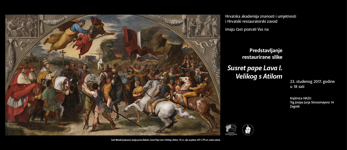 Hrvatska akademija znanosti i umjetnosti i Hrvatski restauratorski zavod imaju čast pozvati Vas na predstavljanje restaurirane slike Susret pape Lava I. Velikog s Atilom, koje će se održati 23. studenog 2017. u 18 sati u Knjižnici HAZU, Trg Josipa Jurja Strossmayera 14, Zagreb.