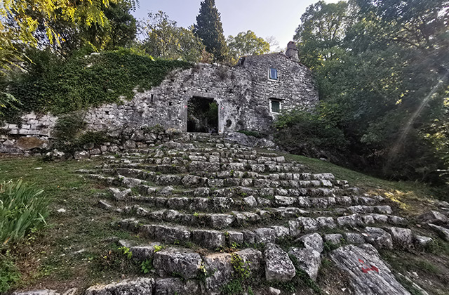 Južnije od kule, na udaljenosti od 19 m, istraženi su građevinski ostatci ulazne prostorije i pristupnog stubišta koje je vodilo do nje. Stubište se spuštalo sve do južnog perimetralnog zida feudalčeve rezidencije, odakle se nastavljalo prema podgrađu. Račvalo se u dva kraka; kod istočnog kraka gazišta su bila postavljena radijalno. Stubište se pružalo u dužini od 14,6 m, pri čemu se svladavala visinska razlika od 3,5 m, nakon čega se pristupalo u ulaznu prostoriju, čije tlocrtne dimenzije iznose 4,3 x 2 m. Uz njezinu istočnu stranu, odnosno uz zapadno lice perimetralnog zida, priklesavanjem stijene i zidanjem formirana je klupa, svojevrsna sedilija. Na njezinu južnom zidu formiran je ulaz sa zidanim dovratcima.