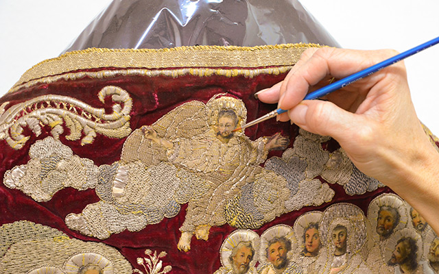 Na felonu s prikazom Uzašašća Kristova 2022. godine izvedeni su cjeloviti konzervatorsko-restauratorski radovi (voditeljica: Sandra Lucić Vujičić, Odjel za tekstil, papir i kožu, Služba za pokretnu baštinu). Dokumentirano je i analizirano zatečeno stanje izradom fotografske i grafičke dokumentacije, predmet je povijesnoumjetnički obrađen te su provedene laboratorijske i tehničke analize. U Prirodoslovnom laboratoriju Zavoda dokazano je košenilno bojilo niti osnove vlaska baršuna s oplećja. Posebno je analizirano bojilo crne broché potke temeljne tkanine prije izvođenja mokrog čišćenja: papirnatim trakicama (Iron Gall Ink Test Paper) u potki su detektirani štetni ioni željeza II, a jednostavnim probama je utvrđeno da je bojilo postojano u negrijanoj destiliranoj vodi. Analize izvedene na Tekstilno-tehnološkom fakultetu i Zavodu za tekstilnu kemiju i ekologiju potvrdile su postojanje močila željezova (II) sulfata – FeSO4 · 7H2O (zelena galica), a za crnu broché potku navodi se da je vjerojatno obojena prirodnim bojilima od biljaka bogatih taninom. S predmeta su odvojene lanena podstava i široka posrebrena traka te završno oplećje od temeljne tkanine. Najizraženije krupne nečistoće zatečene na donjem rubu felona uklonjene su pincetama.