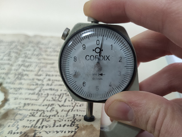 Nakon istraživačkih radova u sklopu kojih je izrađena dokumentacija i fotodokumentacija, uslijedile su probe i analize materijala kako bi se stekao bolji uvid u stanje predmeta, vrstu i porijeklo primijenjenih materijala te odredilo najprimjerenije sredstvo za nastavak radova. Zahtjevni dio bila je identifikacija vrste pergamene koja se određuje prema obradi i vrsti kože. Analizom površine pergamene, primjenom digitalnog mikroskopa DinoLite, ustanovljeno je da je riječ o telećoj pergameni (raspored rupa folikula dlaka postavljen je u linijama u kosim redovima od tri, pet i sedam rupa).