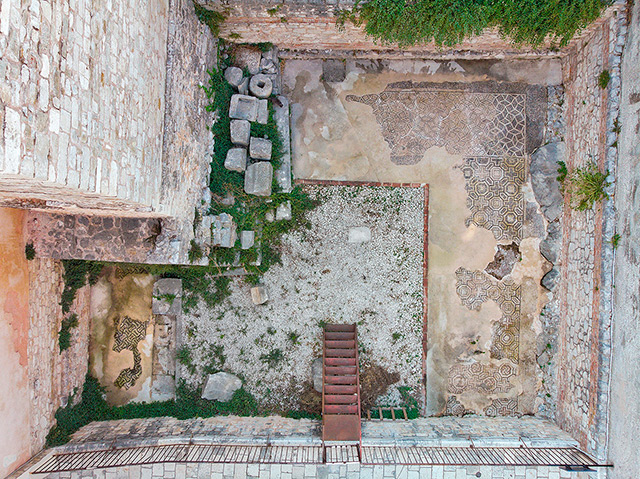 Unutar perimetra Dioklecijanove palače pronađena su dva atrija, odnosno dva otvorena dvorišta popločena geometrijskim mozaicima. Ukrašena dvorišta s mozaicima bila su približno iste veličine (18,5 × 14 m i 18 × 13 m). Jedan atrij nalazi se u današnjoj Arhiđakonovoj ulici, južno od zida temenosa mauzoleja i uz Vestibul, dok je drugi u Bulićevoj ulici, istočno od zida temenosa, a sjeverno od kora katedrale sv. Dujma. Srednjovjekovne građevine i ulice podijelile su oba dvorišta na više segmenata, pa se dijelovi mozaika danas nalaze sub divo, unutar kuća i ispod uličnoga popločenja. Mozaici pripadaju posttetrarhijskom razdoblju, izvedeni su potkraj 4. i početkom 5. stoljeća. U Arhiđakonovoj ulici sjeverni i sjeverozapadni dio mozaika nalaze se na otvorenom sub divo, jugozapadni i južni dio mozaika u prizemlju današnjega Etnografskog muzeja, a istočni u prizemlju današnje Župne kuće. Mozaici u Bulićevoj ulici smješteni su slično kao i u Arhiđakonovoj ulici — istočni dio mozaika je u prizemlju srednjovjekovne kuće i ispod ulice, dok su sjeverni, zapadni i južni dio mozaika sub divo.