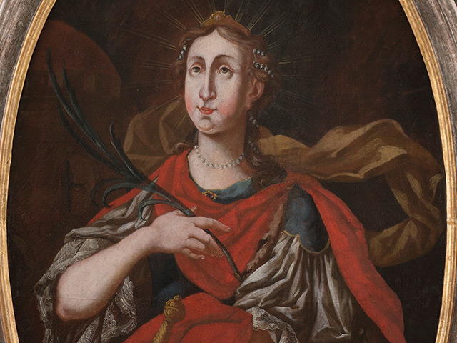 Zanimljivo je da je, nakon čišćenja lica slike, u pozadini otkriven prikaz kule kružnog tlocrta koji je prije bio vrlo teško uočljiv. S obzirom na to da je kula uobičajeni atribut svete Barbare, izvjesno je da je na slici prikazana upravo ta svetica, a ne sveta Katarina. Ta je slika uokvirena bogatim ukrasnim okvirom ovalnog formata koji je polikromiran tirkiznoplavom marmorizacijom te je uz gornji rub zaključen rezbarenim rokoko ukrasom s kartušom obogaćenom rokajnim volutama i vegetabilnim detaljima.