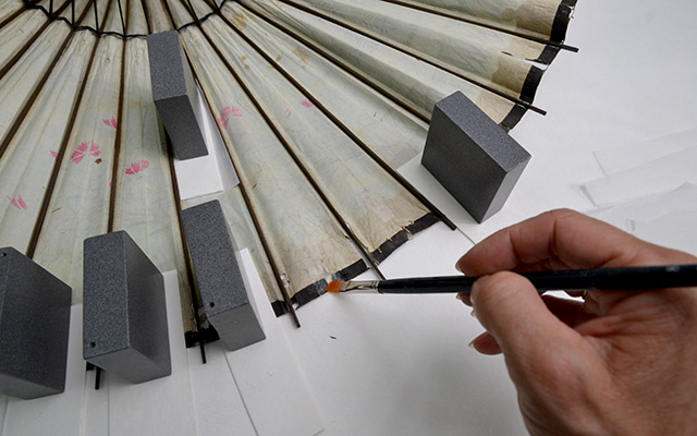Radovi na suncobranu počeli su postupkom suhog čišćenja. Uslijedila je konsolidacija zatečenih poderotina i oštećenja te dopuna nedostajućih dijelova japanskim papirom. Uklonjeni su materijali iz prethodnih neprimjerenih intervencija. Posljednja konsolidacija papirnatog nosioca provedena je na samom vrhu kupole, na spoju rebara gdje je nosilac većim dijelom bio popucan, a među rebrima je mjestimice i nedostajao. Ti su dijelovi nadomješteni manjim fragmentima japanskoga papira trokutastog oblika. Svi konsolidirani i rekonstruirani dijelovi potom su retuširani u lokalnom tonu suhim pastelama u olovci i akvarelnim bojama. Oslabljena drvena konstrukcija suncobrana učvršćena je tankim i čvrstim "lajsnicama" od bambusa lijepljenima na oštećena bambusova nosila. Ti dijelovi su koncem dodatno spojeni za rebra, dok je zatečeni plavi konac ostavljen slobodno unutar konstrukcije kako bi mehanizam otvaranja funkcionirao. Na nosilima mehanizma za otvaranje zatečene su aplikacije od ružičastog papira čije su poderotine konsolidirane. Na držak je postavljena pomična okrugla gumica koja zadržava suncobran u otvorenom položaju, s obzirom na to da taj mehanizam nedostaje. Nedostajući dio drška nije rekonstruiran.