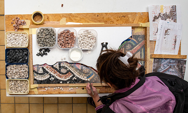 Nepredvidivi djelomični ili potpuni gubitak ostataka mozaika in situ zahtijevao je ekspeditivnost pri njegovu stabiliziranju/konsolidiranju s ciljem očuvanja materijalnog i duhovnog integriteta. Stabiliziranje/konsolidiranje je podrazumijevalo: konsolidiranje lica mozaika i dizanje mozaika s izvornog mjesta prema planu rezova, konsolidiranje poleđine ulomaka u radionici, čišćenje i pripremanje prostorije za prihvat mozaika, postavljanje nove žbukane podloge u obuhvatnoj zoni, pozicioniranje mozaika in situ, čišćenje lica mozaika od zaštitnog sloja, postavljanje završne žbuke između ulomaka mozaika i konsolidiranje lica mozaika. Konsolidiranje lica mozaika izvedeno je različitim metodama i tehnikama (injektiranje, konsolidiranje mehaničkih oštećenja i sljubnica/fuga te impregniranje lica mozaika). Nakon vraćanja stabiliziranih izvornih mozaika in situ, uslijedila je sljedeća radna faza u radionici – izrada replike/rekonstrukcije dijela mozaika i njegovo postavljanje in situ. Za izradu novih ulomaka izrađen je detaljni grafički crtež/predložak sa shemom likovne geometrijske dekoracije mozaika u odnosu na izvorni mozaik. Predložak je izrađen u mjerilu 1 : 1 i sastavljen je plan/nacrt izrade s budućim ulomcima rekonstrukcije. Rekonstrukcija je izrađena u pet različitih dijelova/ulomaka određene veličine radi lakše manipulacije pri izradi, postavljanja in situ i lakšeg transporta iz radionice do nalazišta. Nakon izrade crteža, ručno su izrađene kockice od prirodnog kamena lokalnog porijekla, koje su poslužile za izradu novih ulomaka tzv. indirektnom metodom. Prije postavljanja replika in situ, ulomci su probno postavljeni u obuhvatno područje; pritom se pazilo da slijede likovnu dekoraciju i visinsku razliku između izvornih mozaika. Nakon utvrđivanja svih navedenih činjenica, postavljen je žbukani prihvatni sloj između podloge i ulomaka. Kad je postignuta kompatibilnost ulomaka i podloge, uslijedilo je mehaničko-kemijsko čišćenje površine te izrada retuša s izvornim kockicama na mjestima većih mehaničkih oštećenja, kao i na spoju izvornih i novih ulomaka mozaika. Novonastala mozaična površina fugirana je adekvatnom vapnenom žbukom, dodatno je očišćena kemijski neutralnim sredstvima i naposljetku impregnirana. (IJ)