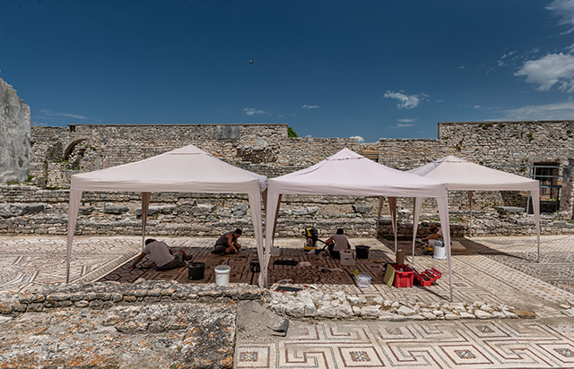 Pod vodstvom Tonija Šaine, u sezoni 2022./2023. provedeni su i konzervatorsko-restauratorski radovi interventne zaštite dijelova mozaika arheološke zone u sjevernom dijelu kompleksa. Izrađena je dokumentacija postojećega stanja mozaika koja je, osim za bilježenje oštećenja i provedenih intervencija, poslužila i kao podloga za razlikovanje kopije i izvornih dijelova mozaika u komparaciji s dostupnom arhivskom dokumentacijom. Konzervatorsko-restauratorski radovi na mozaicima uključili su uklanjanje privremene zaštite i čišćenje površine mozaika te opšivanje i učvršćivanje nestabilnih dijelova mozaičke površine, materijalima odabranima prema prethodno izvedenim probama.