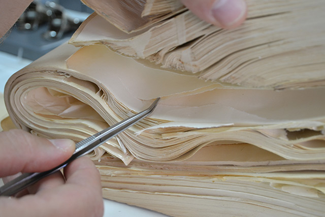Suhim čišćenjem uklonjene su površinske nečistoće s površine papirnatog nosioca te s bočnih strana na kojima je umjetnina spajana ljepilom. Bočne strane su dodatno očišćene mokrim postupkom, mješavinom vode i alkohola. Aplikacija na gornjoj plohi skulpture također je suho i površinski mokro očišćena prije ponovnog spajanja dijelova u cjelinu. Mrlje su tretirane i ublažene kalcijevim hidroksidom. Deformirani dijelovi skulpture su izravnati, a poderotine su sanirane celuloznim ljepilom i ojačane japanskim papirom. Zatim je izveden retuš, da bi se ujednačila površina s mrljama i poderotinama te s dijelovima koji su zbog fotooksidacije promijenili boju. Za umjetninu će biti izrađena kutija za pohranu u svrhu zaštite od oštećenja pri rukovanju i pohrani. (AŠ)