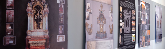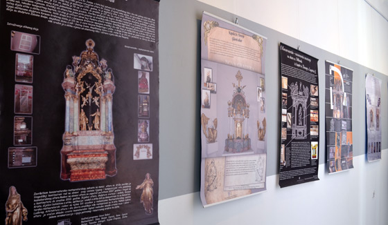 Restauratorski centar Hrvatskog restauratorskog zavoda iz Ludbrega izložbom postera predstavlja rad na najvažnijim projektima konzervatorsko-restauratorskih zahvata provedenih na oltarnim cjelinama iz ratom zahvaćenih područja Republike Hrvatske, ali i rad na umjetninama iz crkvenih i muzejskih zbirki kontinentalne Hrvatske. U sklopu Programa evakuacije ratom ugrožene spomeničke baštine na području kontinentalne Hrvatske 1992. godine organizirano je petnaestak tajnih depoa, a dvorac Batthyany u Ludbregu pružao je osnovne uvjete za pohranu evakuiranih umjetnina. Kao rezultat uspješne suradnje grada Ludbrega, Ministarstva prosvjete, kulture i športa i bavarskih stručnjaka, Centar je otvoren 1994. godine, dok se do 2000. godine proširio na veći dio prostora dvorca. Restauratorski centar Ludbreg dio je Hrvatskog restauratorskog zavoda od 1997. godine. U proteklih dvadeset godina naši su restauratori obnovili brojne umjetnine iz više od osamdeset lokaliteta kontinentalne Hrvatske. Prvih desetak godina radilo se isključivo na saniranju ratnih šteta, a prioritet su imale umjetnine na kojima je trebalo izvesti manje složene zahvate i koje će biti moguće vratiti u matične objekte. Radilo se uglavnom o drvenim, rezbarenim, polikromiranim, pozlaćenim i posrebrenim oltarnim cjelinama prve polovice 18. stoljeća i o manjem broju očuvanih vrlo vrijednih oltara iz druge polovice 17. stoljeća iz okolice Siska, Bjelovara, Karlovca, Slavonskoga Broda i šire okolice Zagreba. U okviru programa ratnih šteta obnovljena su i tri oltara iz crkve sv. Tome u Tomašu kod Bjelovara. Drveni, rezbareni, polikromirani, pozlaćeni, posrebreni s lazurama glavni oltar sv. Tome datiran je u 1756. godinu, a ima dvije oltarne pale i skladno modelirane, pozlaćene i posrebrene skulpture svetaca. Autor oltara nije poznat, ali je izvedbom polikromije u tehnici „flajderunga“ tipičan primjer kasnobaroknog inventara druge polovice 18. st. Dimenzije su mu 716 x 500 cm, a nakon obnove smješten je u prostor broda jer obnovom gotički oblikovanog svetišta više nije mogao biti postavljen na izvornu poziciju. Dva drvena, rezbarena, polikromirana, pozlaćena i posrebrena bočna oltara uz trijumfalni luk s titularima sv. Barbare i sv. Bartolomeja su datirani na prijelaz 17. na 18. stoljeće. Predstavnici su rijetko očuvanih crnih, dvokatnih, tektonsko-plošno koncipiranih oltara tipičnih za drugu polovicu 17. st., a kompozicijski su upotpunjeni bogato izrezbarenim dekorativnim elementima i skulpturama svetaca nepoznatog autora. Dimenzije su im 420 x 170 cm, a nakon obnove smješteni su na izvorne pozicije u crkvi. Godine 2004. aktiviran je i Odsjek za tekstil koji se bavi preventivnom zaštitom, konzervacijom i restauracijom povijesnog tekstila: liturgijskog ruha, narodnih i građanskih nošnji, zastava i drugih tekstilija pa se zahvaljujući toj ’deficitarnoj’ djelatnosti suradnja proširila na muzejske ustanove.