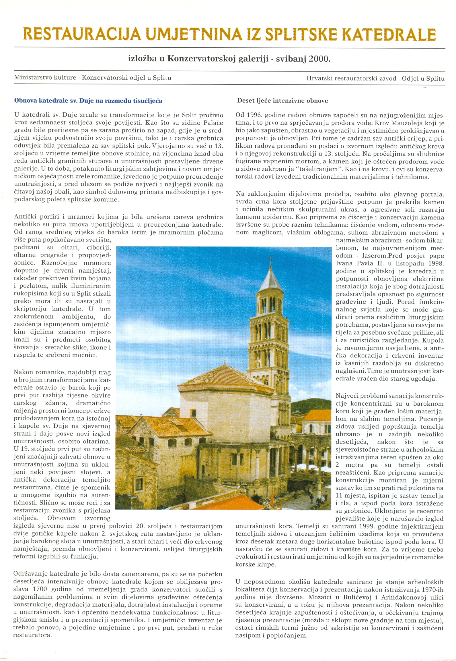 Deplijan je izdan prigodom otvorenja nove zgrade Hrvatskog restauratorskog zavoda u Splitu i popratne izložbe istaknutijih umjetnina koje su restaurirane u splitskoj radionici od njezina osnutka 1954. godine.